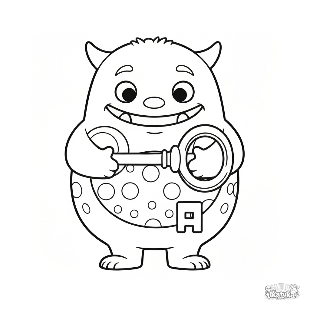 Раскраска для детей 2-4 лет. Милый пухлый монстр с животиком в горошек держит большой старинный ключ обеими лапками. Простой рисунок с широкими полями. Скачать бесплатно.