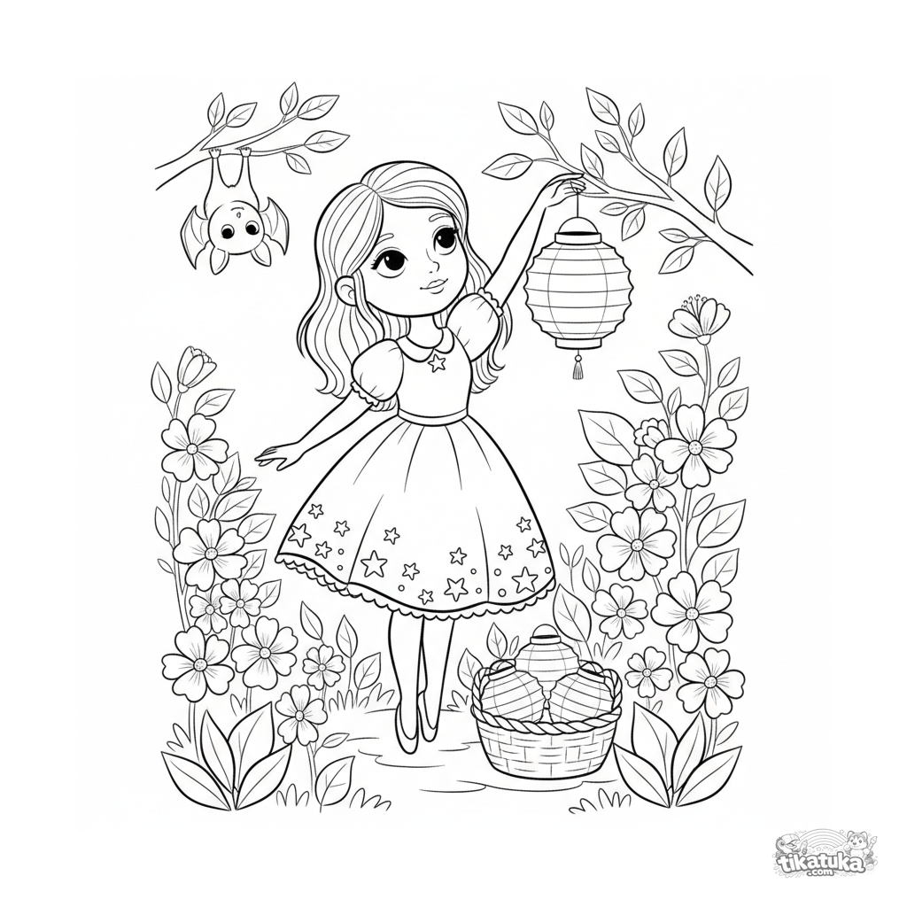 Раскраска для детей 4-6 лет: лунная принцесса развешивает бумажные фонарики в ночном саду. Платье со звездами, цветы, летучая мышь.
