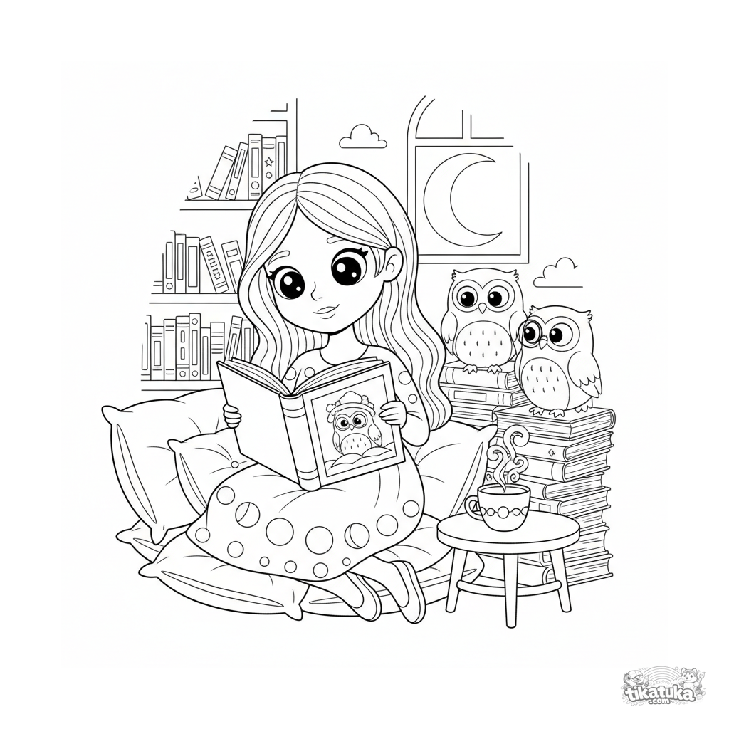 Раскраска для детей 7-9 лет: лунная принцесса читает книгу совам в уютном уголке библиотеки. Умиротворяющая сцена с деталями.