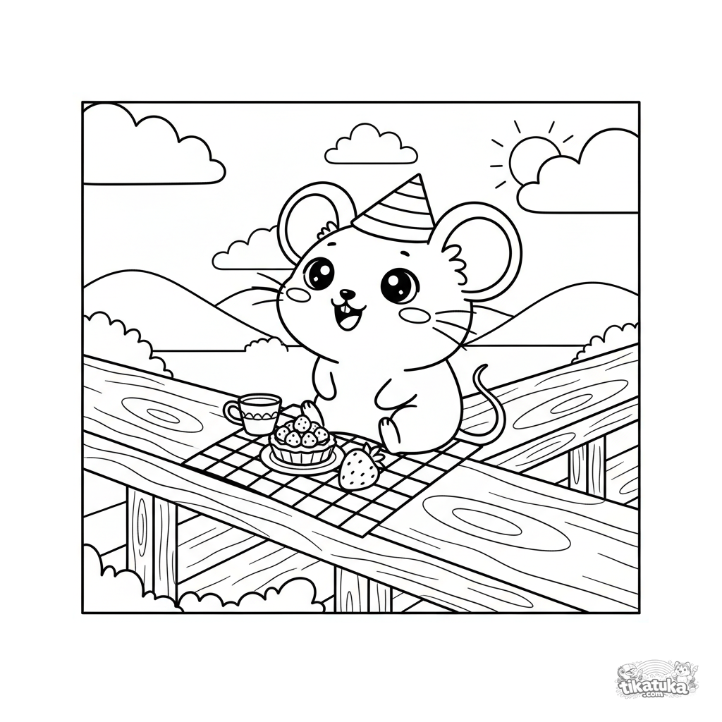 Раскраска для детей 7-9 лет: крошечная мышка в шляпке устроила пикник на перилах дачной веранды с ягодным пирогом. Милая и подробная сценка в кавайи-стиле.