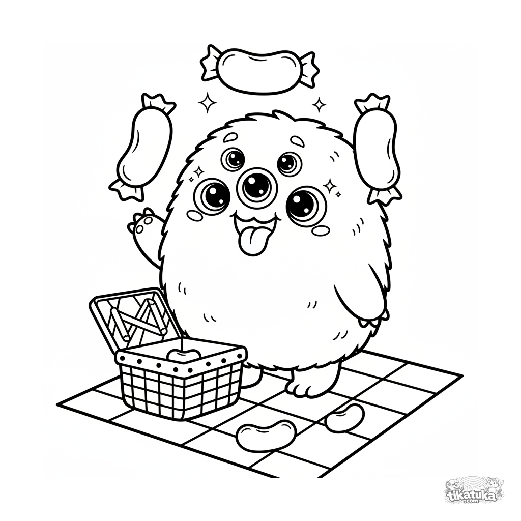 Раскраска для детей 7-9 лет: пушистый многоглазый монстр в стиле чиби жонглирует мармеладками на пикнике. Динамичная и забавная сцена.
