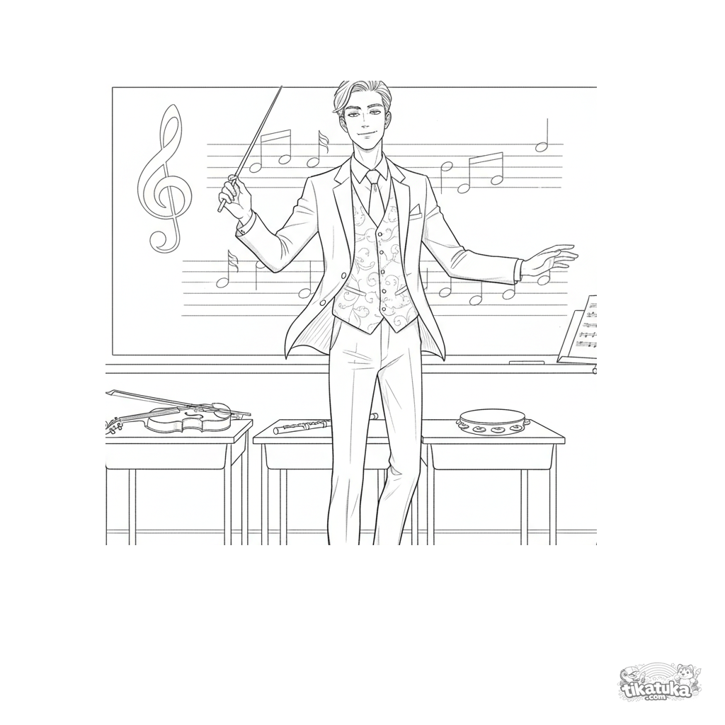 Раскраска для детей 10-12 лет: увлечённый учитель музыки дирижирует воображаемым оркестром из инструментов в школьном классе перед доской с нотами.