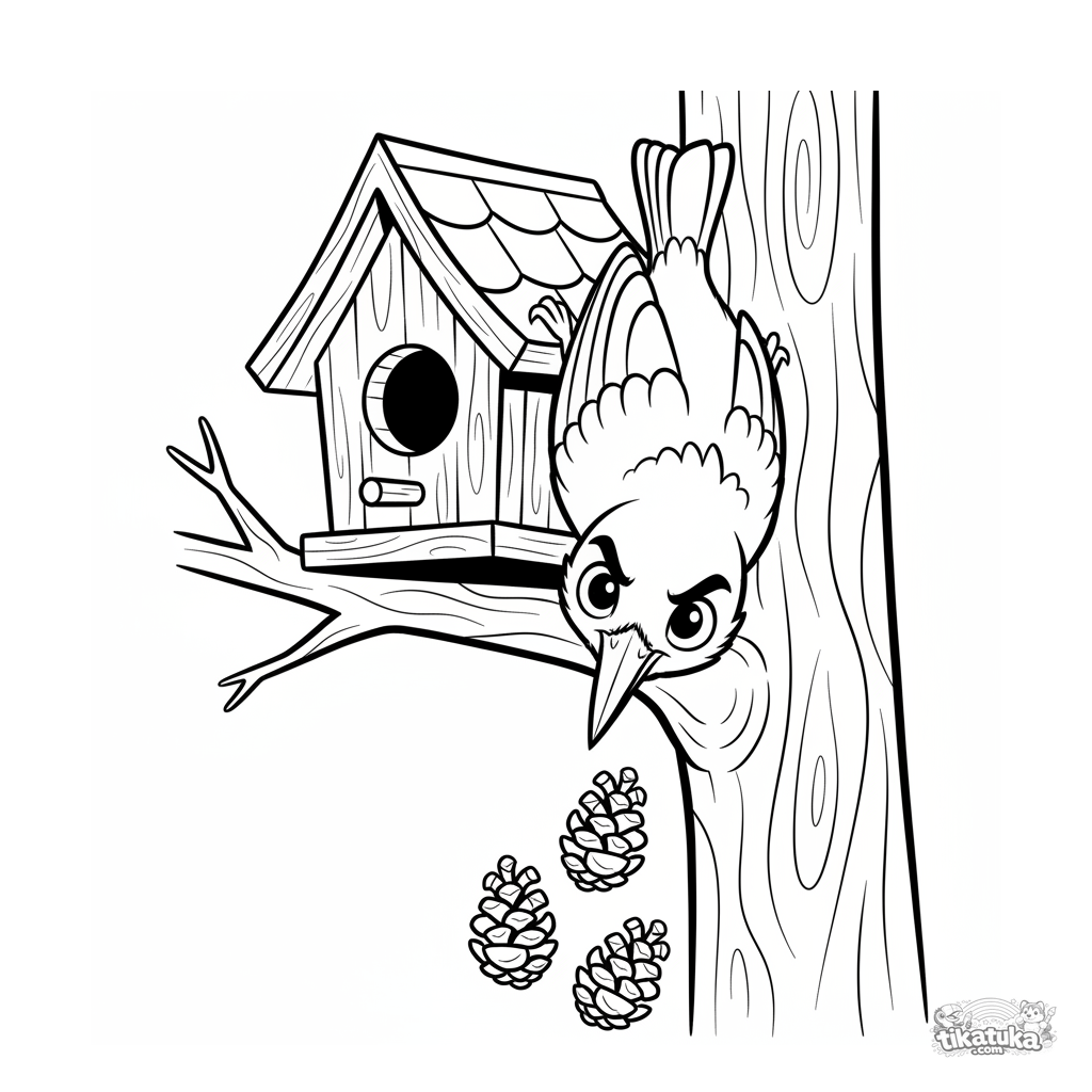 Раскраска для детей 7-9 лет: ловкий поползень висит вниз головой на крыше деревянного скворечника. Динамичная поза, выразительные черты в стиле комиксов, детали крыши.
