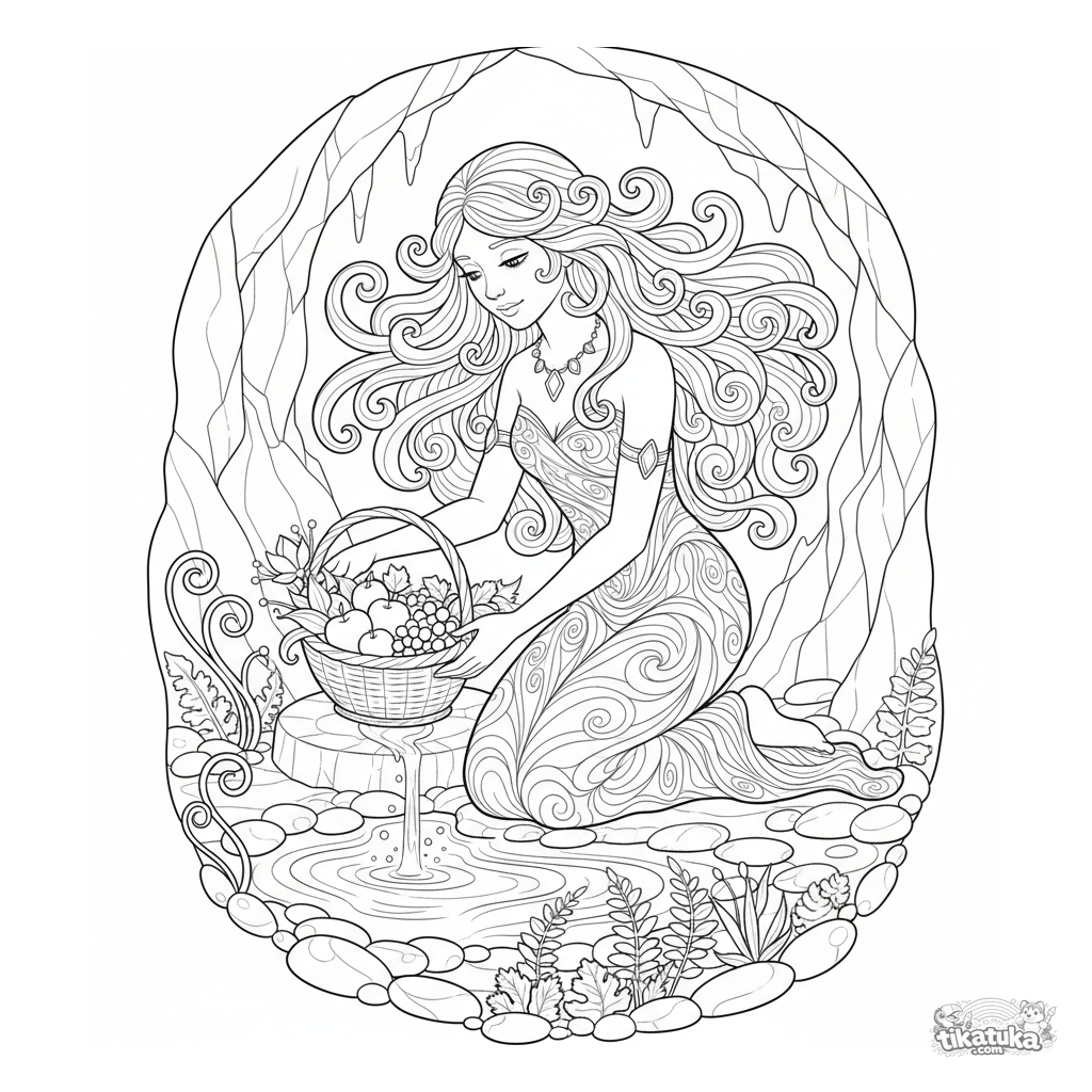 Раскраска: нимфа приносит дары в логово Горгоны. Для детей 10-12 лет. Изящная сцена в стиле модерн с детализированными линиями.
