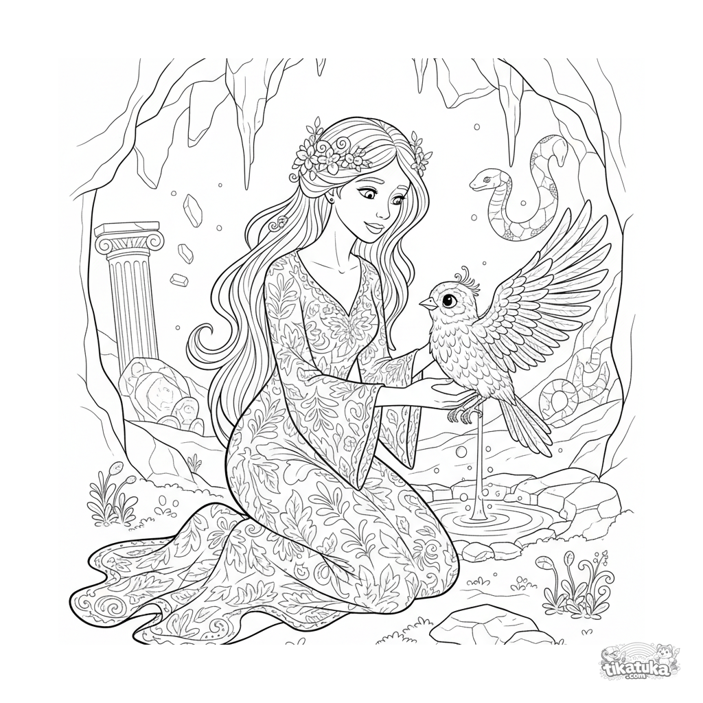 Сложная раскраска в стиле ар-нуво для детей 10-12 лет: нимфа у родника в логове Горгоны возвращает к жизни окаменевшую птицу. Изящные плавные линии, детальная проработка.