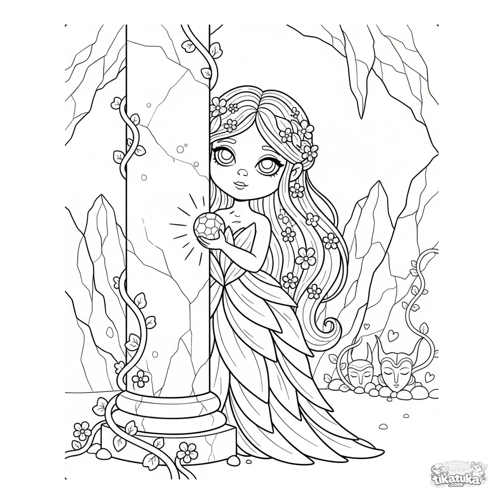 Раскраска в стиле ар-нуво для детей 4-6 лет: застенчивая нимфа с волосами-листьями выглядывает из-за колонны в логове Горгоны. Плавные линии, природные мотивы.