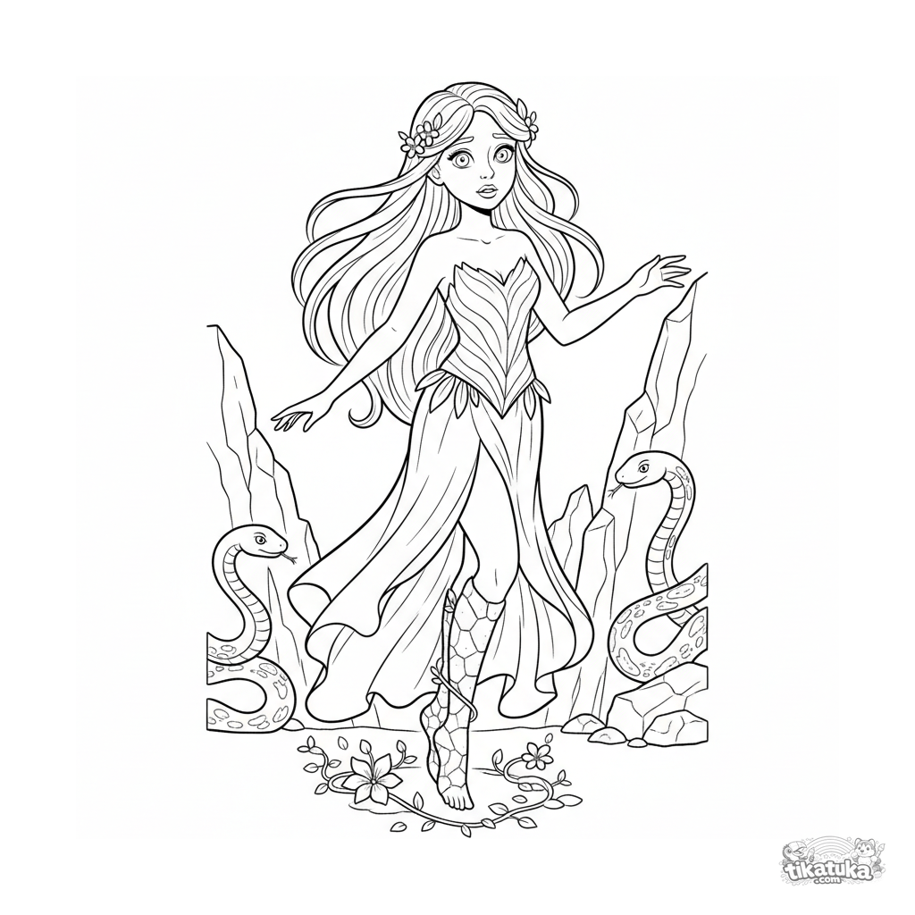 Раскраска для детей 4-6 лет: лесная нимфа в логове Медузы начинает превращаться в каменную статую. Сцена с элементами волшебного превращения.