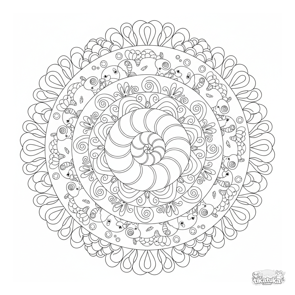 Детальная океанская мандала-раскраска для детей 10-12 лет. Спираль наутилуса в центре, кольца волн, морские коньки, чешуйки рыб, шестикратная симметрия.