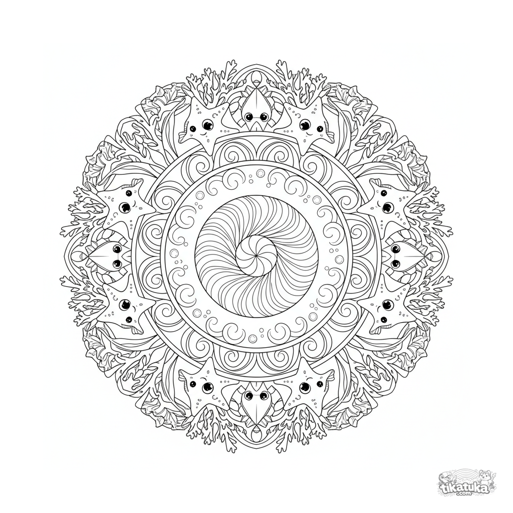 Детальная океанская мандала для раскрашивания с ракушкой, волнами и морскими обитателями. Сложная раскраска для детей 10-12 лет.
