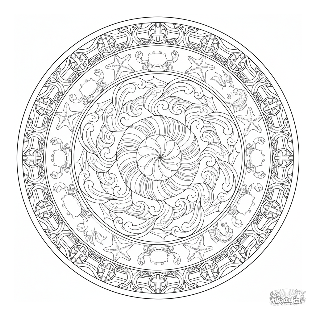 Детальная океанская мандала для раскрашивания с ракушкой, волнами и морскими обитателями. Сложный симметричный узор для детей 10-12 лет.