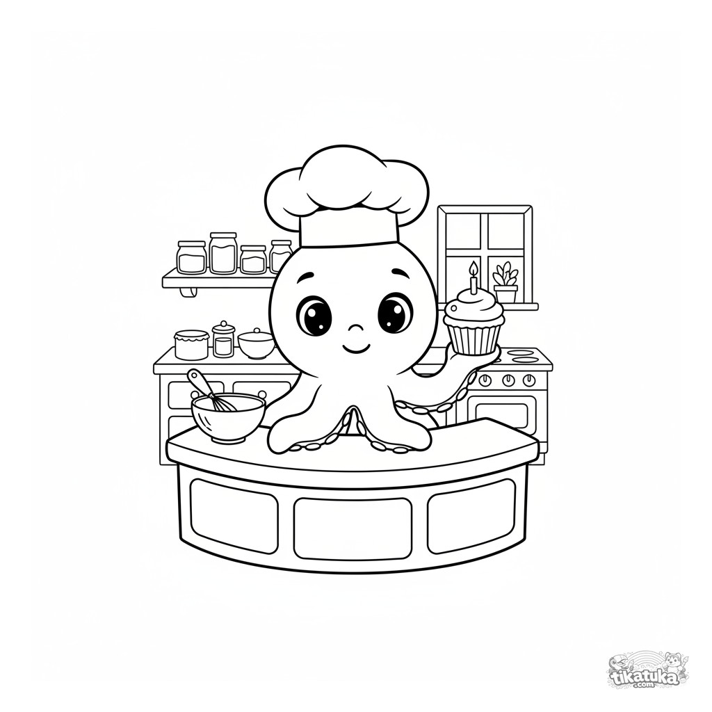 Раскраска для детей: осьминожка-Бублик в колпаке пекаря готовит кекс в уютной кухоньке. Милые детали, простые формы, широкие чистые поля.