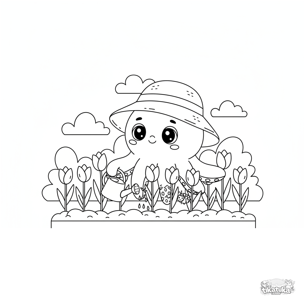 Раскраска для детей: осьминожка-Бублик в шляпе садовника поливает тюльпаны из лейки. Милая сценка, простые формы, широкие чистые поля для раскрашивания.