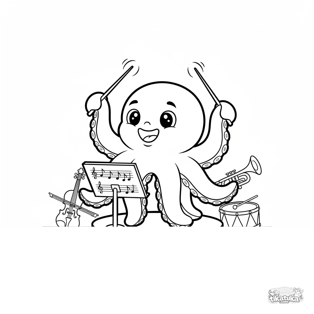Раскраска музыка: осьминожка Бублик дирижирует оркестром с энергией и радостью. Динамичная поза, простые детали, скандинавский дизайн, для детей 4-6 лет.