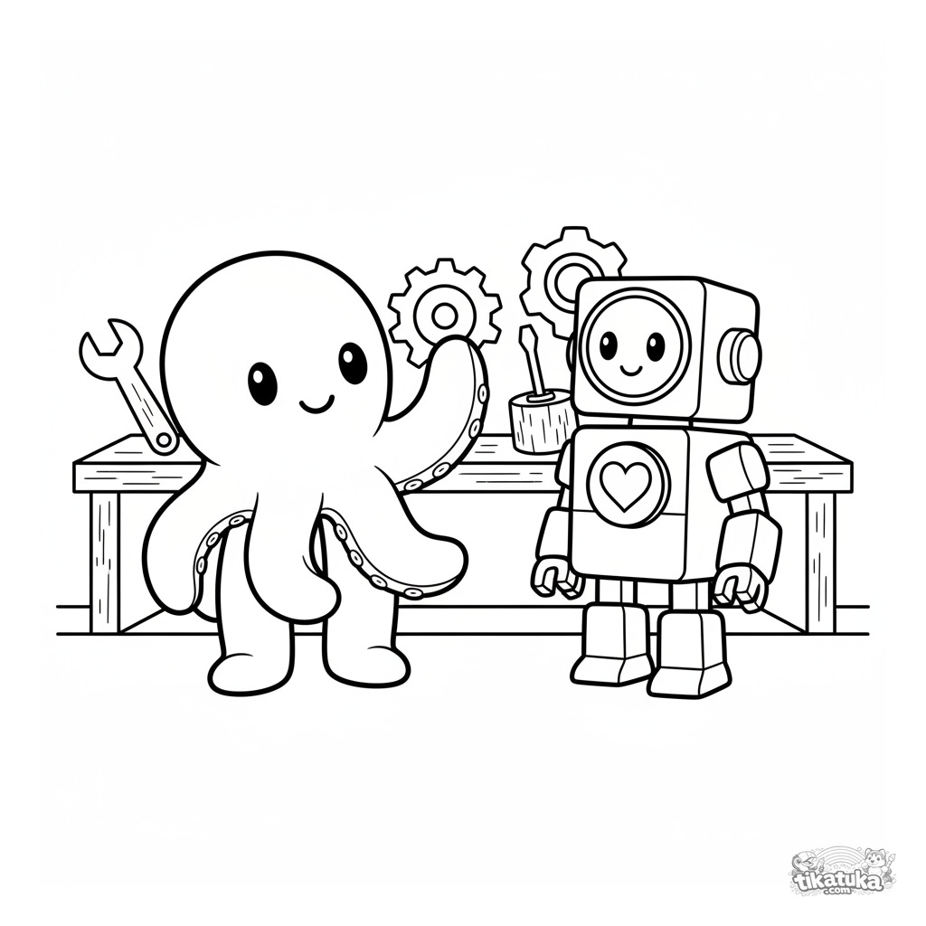 Раскраска для мальчиков: осьминожка Бублик знакомится с добрым роботом в мастерской. Четкие контуры, скандинавский стиль игрушки, для детей 4-6 лет.