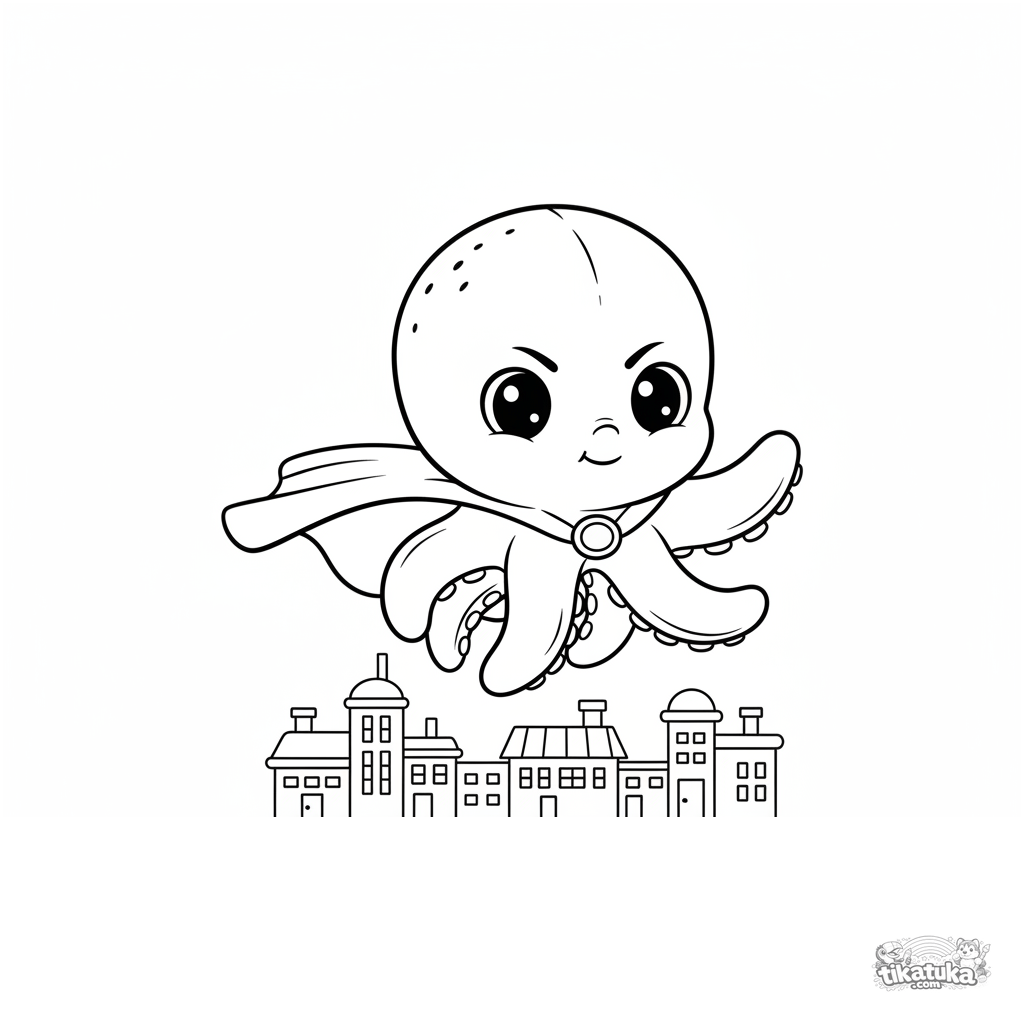 Раскраска для детей: осьминожка-Бублик в плаще супергероя летит над игрушечным городком. Динамичная поза, простые формы домов, широкие поля.