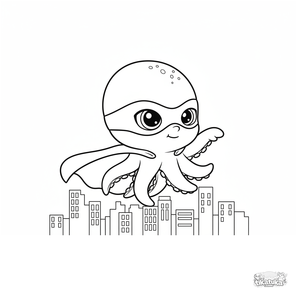 Раскраска для детей 4-6 лет: осьминожка-Бублик в плаще супергероя летит над городом. Динамичная поза, простой силуэт небоскрёбов.