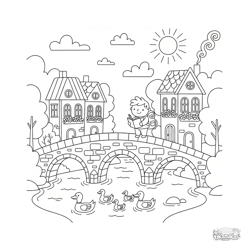 Раскраска для детей: старый каменный мост через реку с утками и путешественником, рисующим вид. Уютная городская сцена в народном стиле.