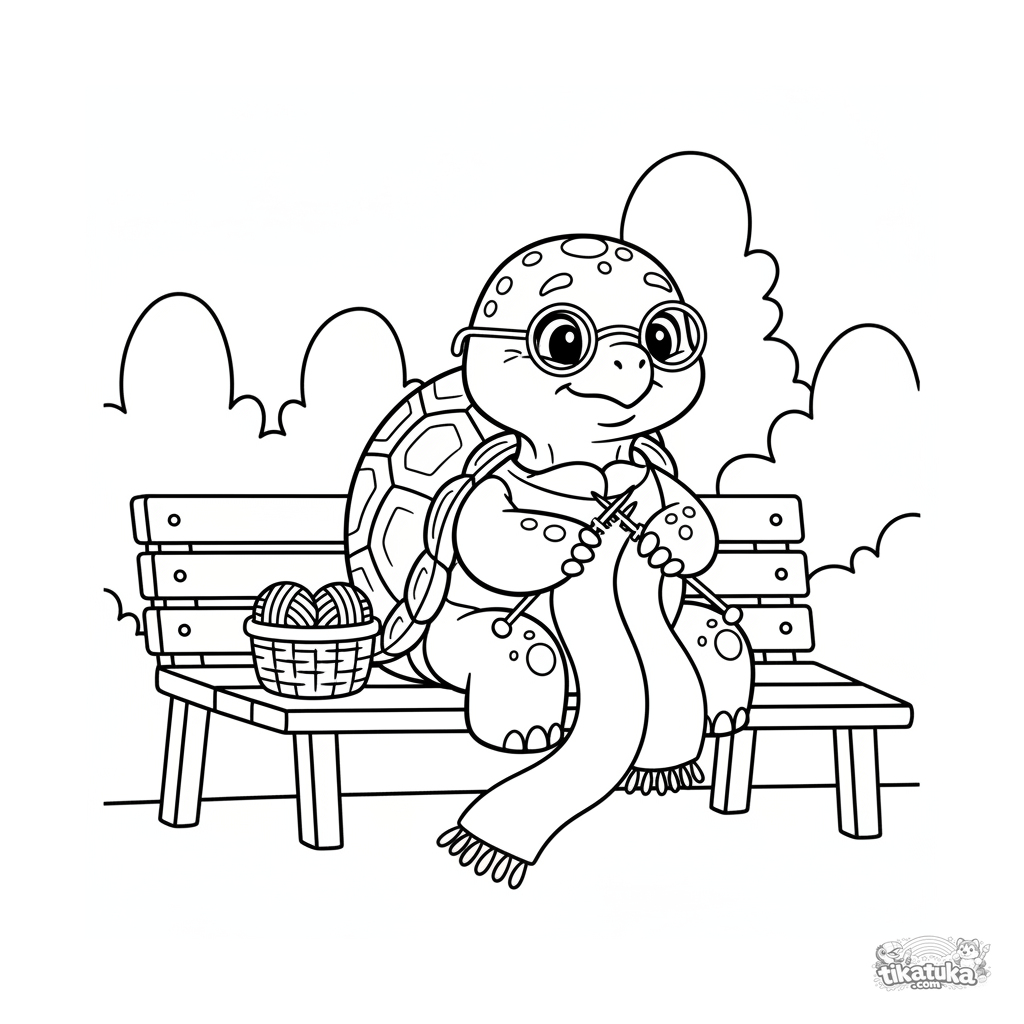 Раскраска для малышей 2-3 лет: большая дружелюбная черепаха вяжет шарф на парковой скамейке. Простые формы, широкие поля для раскрашивания.