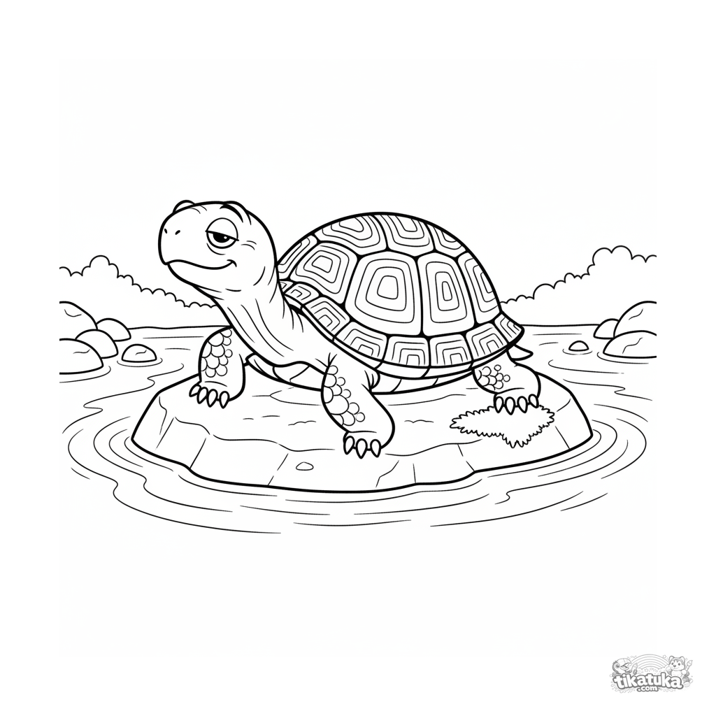 Раскраска для детей 7-9 лет: старая черепаха нежится на тёплом камне посреди ручья. Сцена в народном стиле с характерными узорами и спокойным настроением.