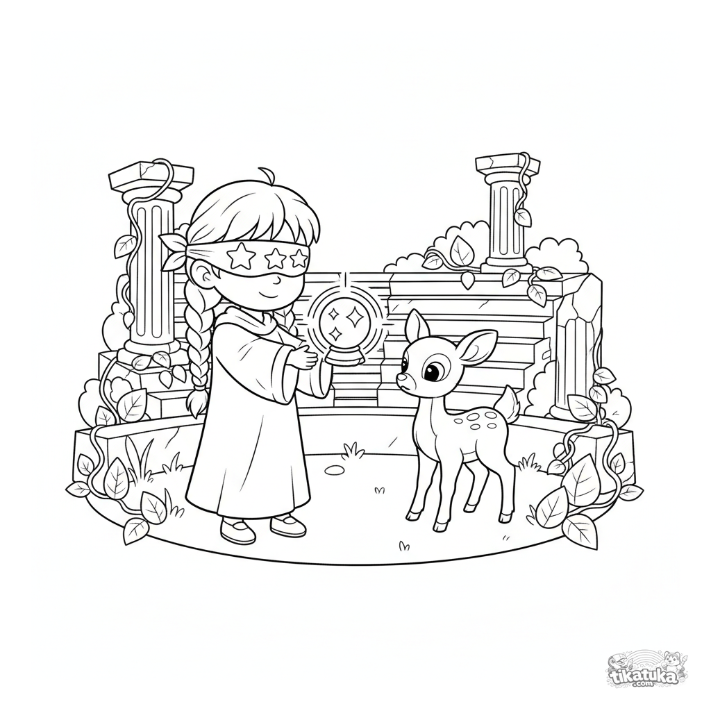 Раскраска для детей: ребёнок-оракул со звёздной повязкой на глазах предлагает светящийся кристальный шар заблудившемуся оленёнку среди руин амфитеатра.