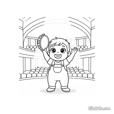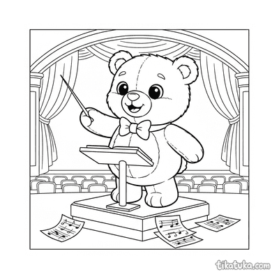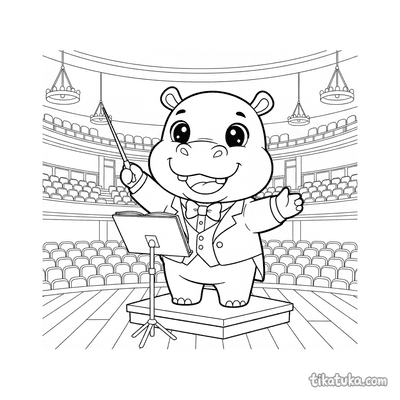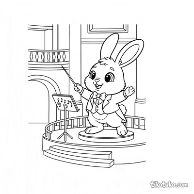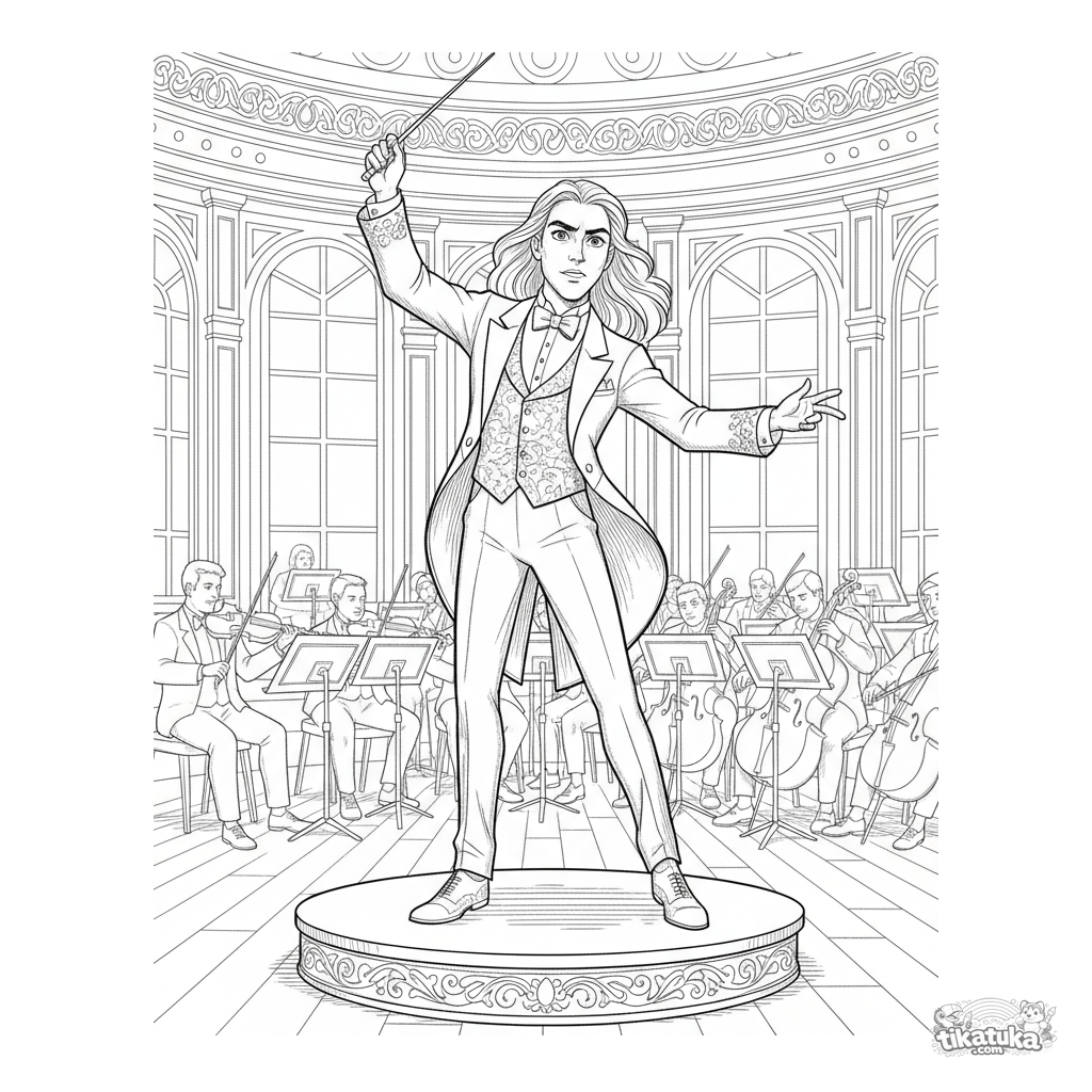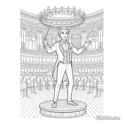 Раскраска для детей 10-12 лет: дирижер в момент кульминации произведения на сцене концертного зала. Высокий уровень детализации, динамичная поза.