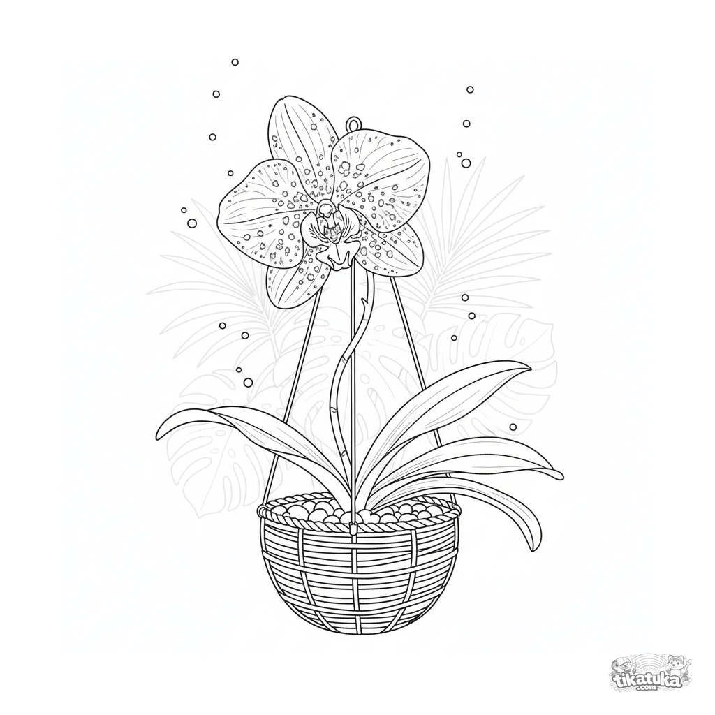 Сложная раскраска для детей 10-12 лет: детализированная орхидея в подвесной корзине в оранжерее с каплями влаги. Тропическая атмосфера.
