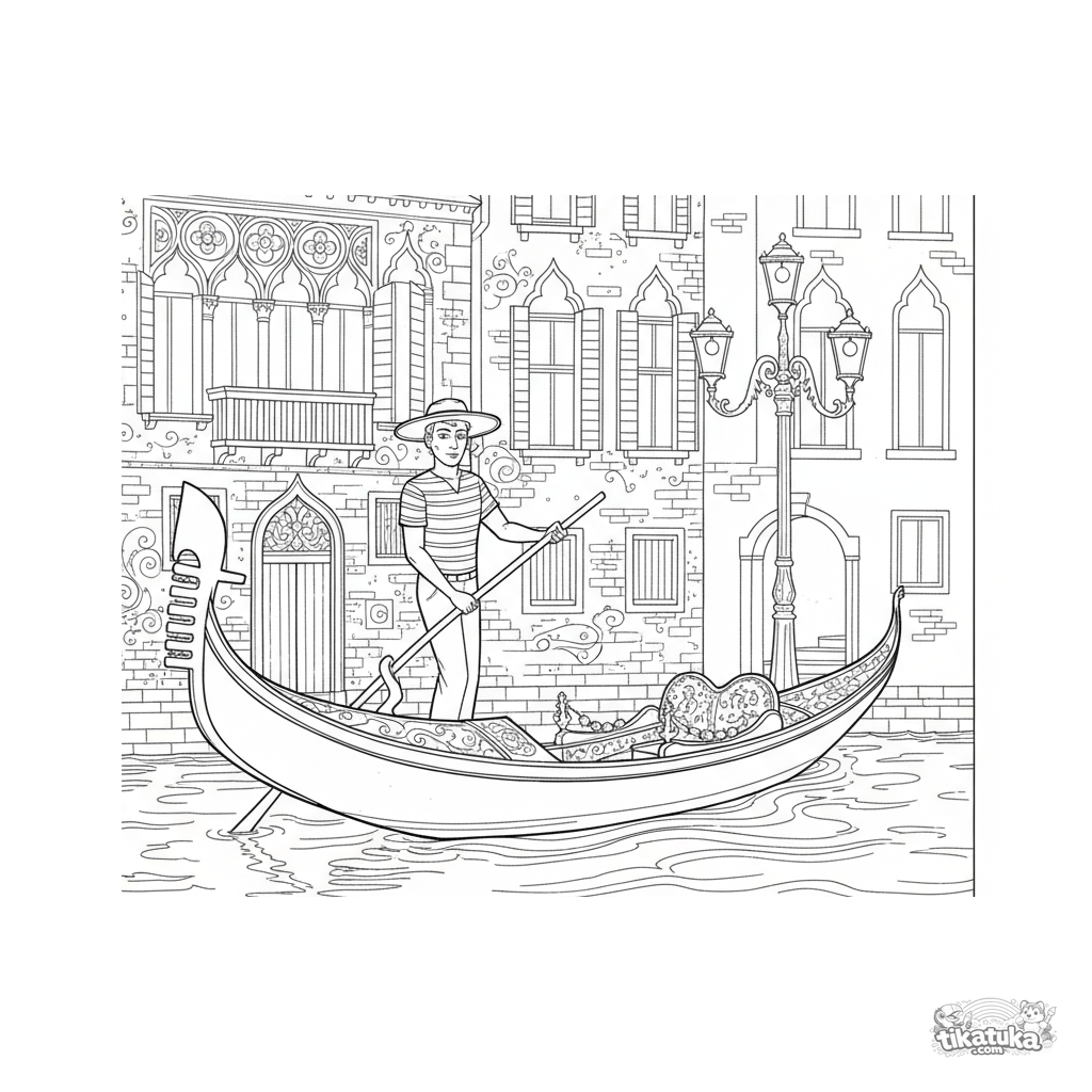 Сложная раскраска для детей 10-12 лет: детализированная венецианская гондола плывет по каналу на закате. Отражения в воде, архитектура и атмосфера требуют внимания к деталям.
