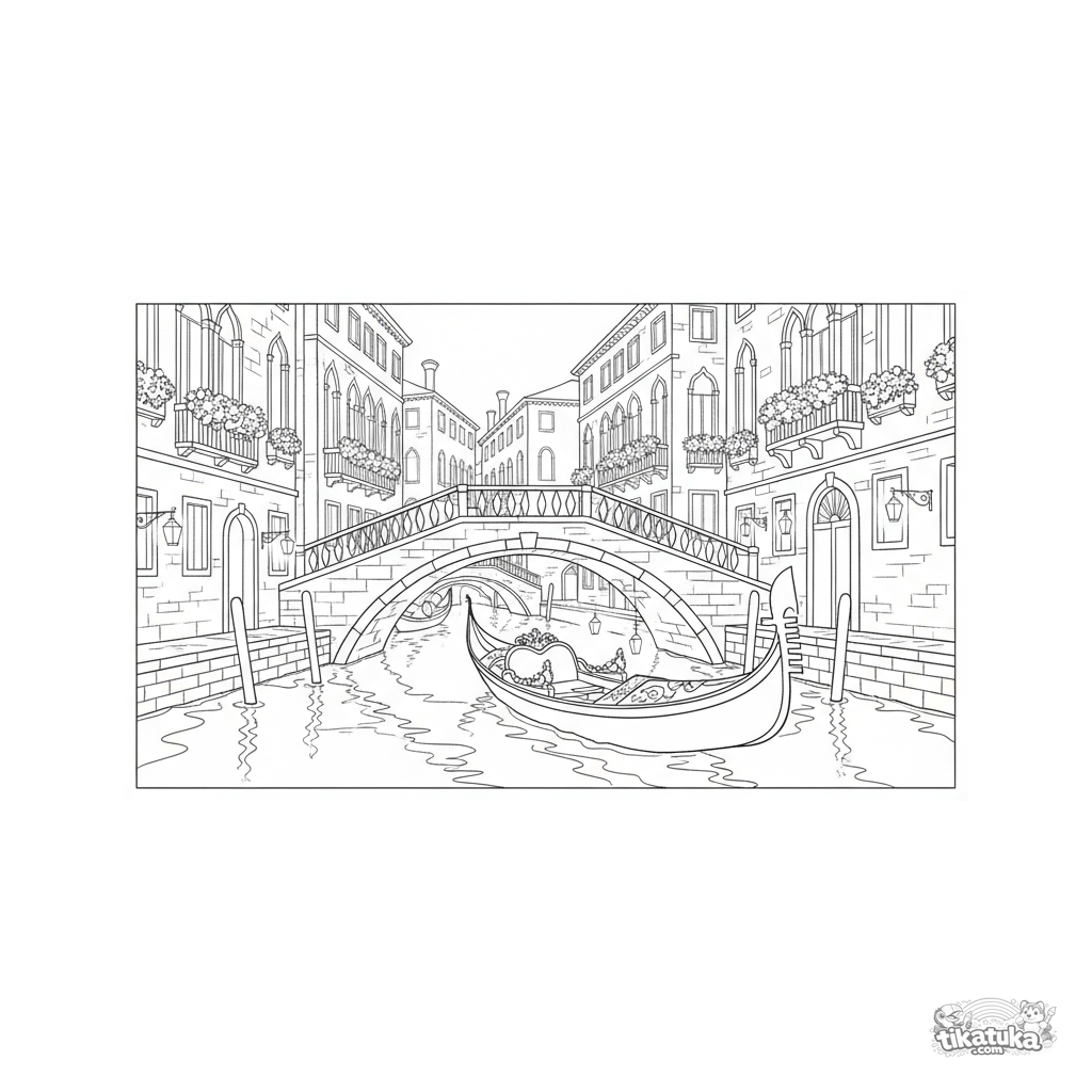 Раскраска для детей 7-9 лет: детализированная венецианская гондола с фонарями плывет под каменным мостом в сумерках. Архитектура и отражения в воде.