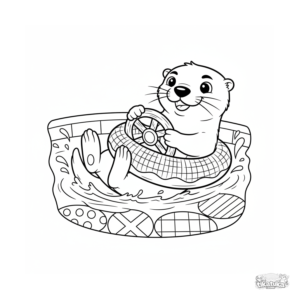 Раскраска для детей 7-9 лет: озорная выдра плавает на спине и крутит надувной круг на поверхности бассейна. Динамичная и весёлая сцена с выразительной мимикой.