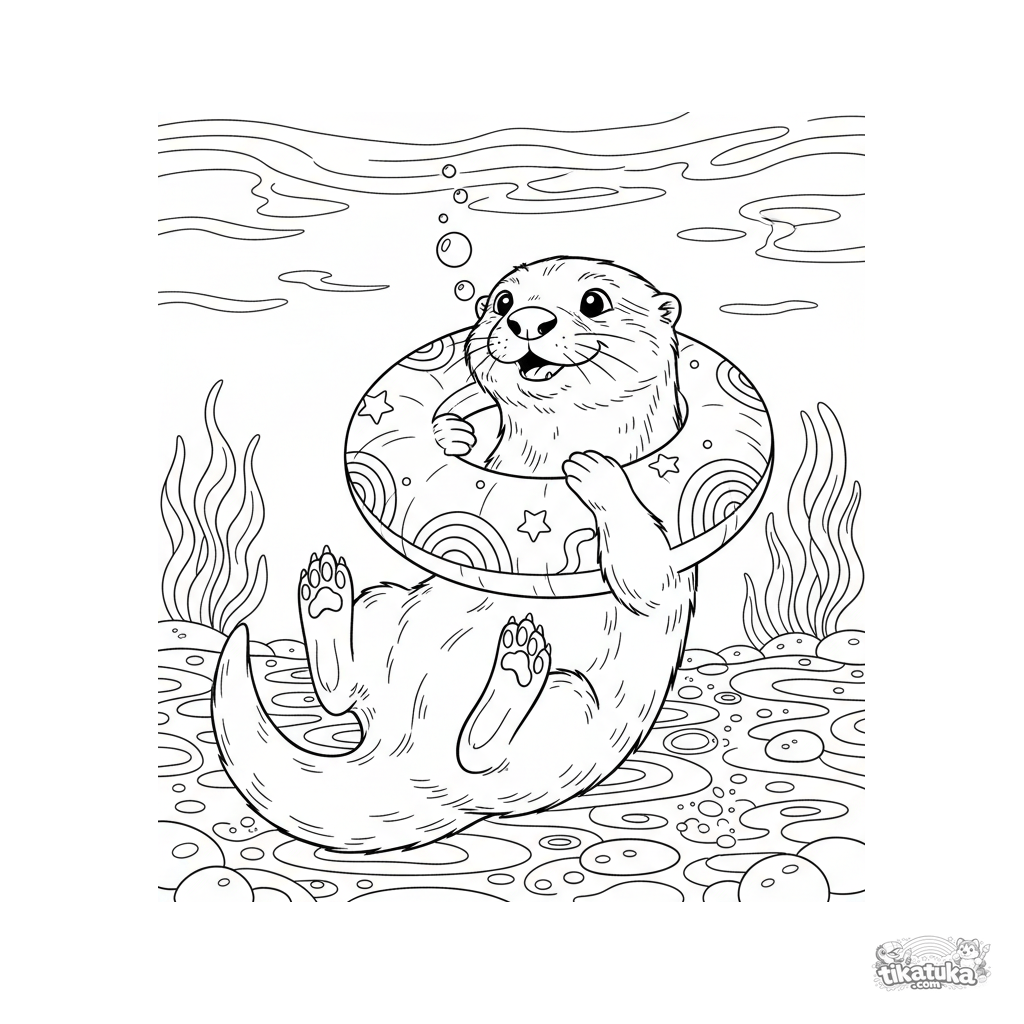 Детальная раскраска для детей 10-12 лет: игривый детёныш выдры лежит на дне бассейна и держит над собой надувной круг. Реалистичные пропорции, выразительная поза.