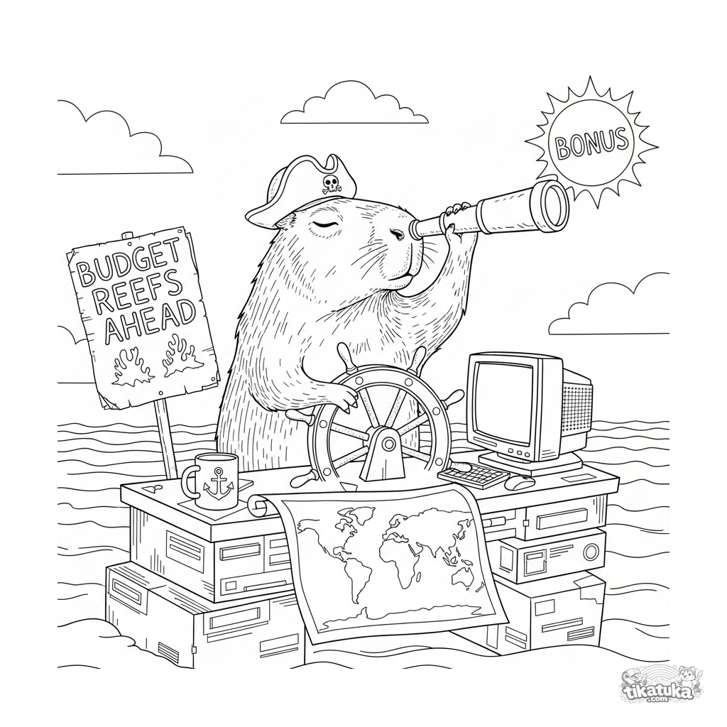 Сложная раскраска для детей 10-12 лет: самоуверенная капибара в пиратской шляпе ищет премию в подзорную трубу, стоя у штурвала офисного стола. Детализированный смешной мем с морским антуражем.