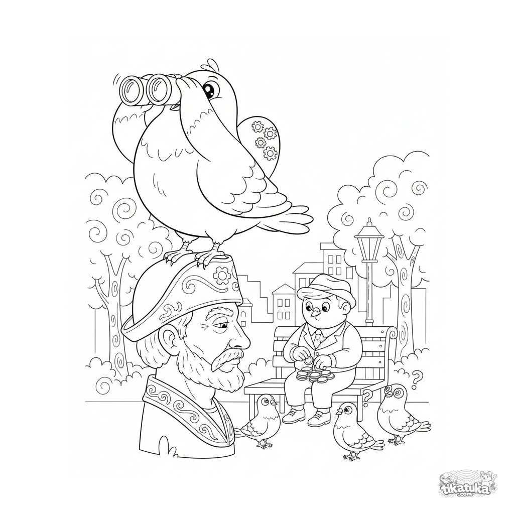 Раскраска для детей: самоуверенный пухлый голубь с биноклем на голове парковой статуи, свысока смотрит на человека, считающего монеты. Хаотичная смешная сцена в стиле ретро-мультфильма.