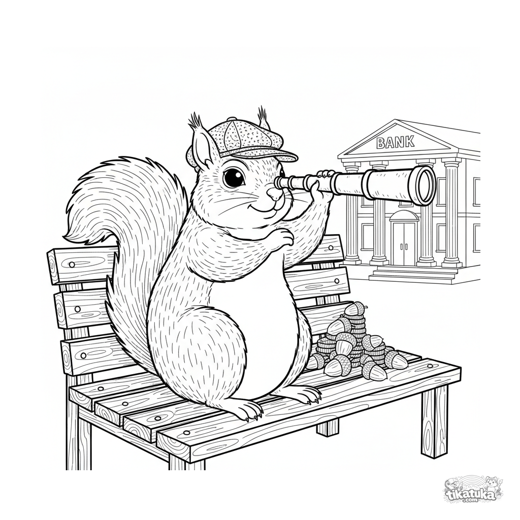Раскраска для детей 10-12 лет: уверенная в себе белка на парковой скамейке с телескопом, высматривающая зарплату в банке. Детализированная реалистичная сцена для раскрашивания.