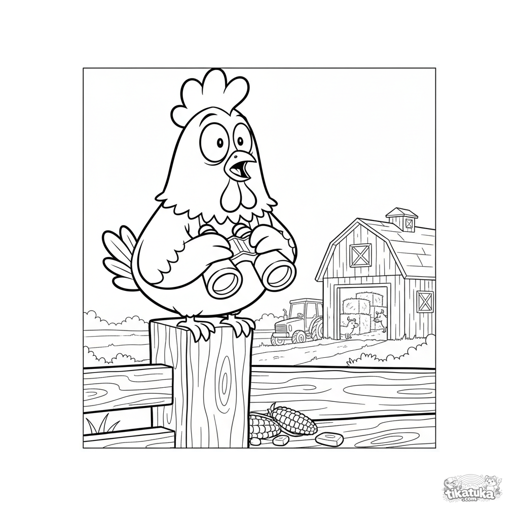 Раскраска для детей 10-12 лет: курица в панике на столбе забора смотрит в бинокль на что-то в сарае. Смешной мем с преувеличенной реакцией и деталями.