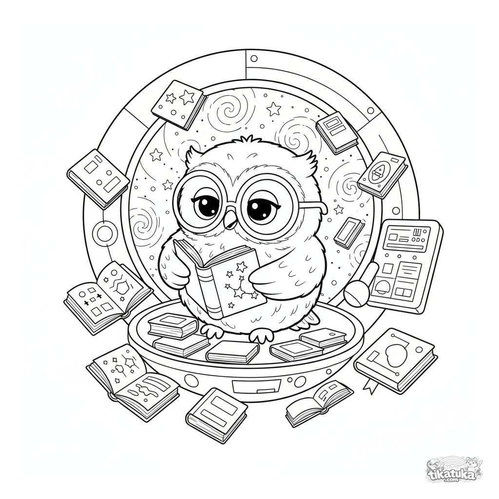 Раскраска для детей 4-6 лет: милый совёнок-библиотекарь Уфф парит в космической библиотеке, расставляя книги. Простые линии, скандинавский стиль плюшевой игрушки.
