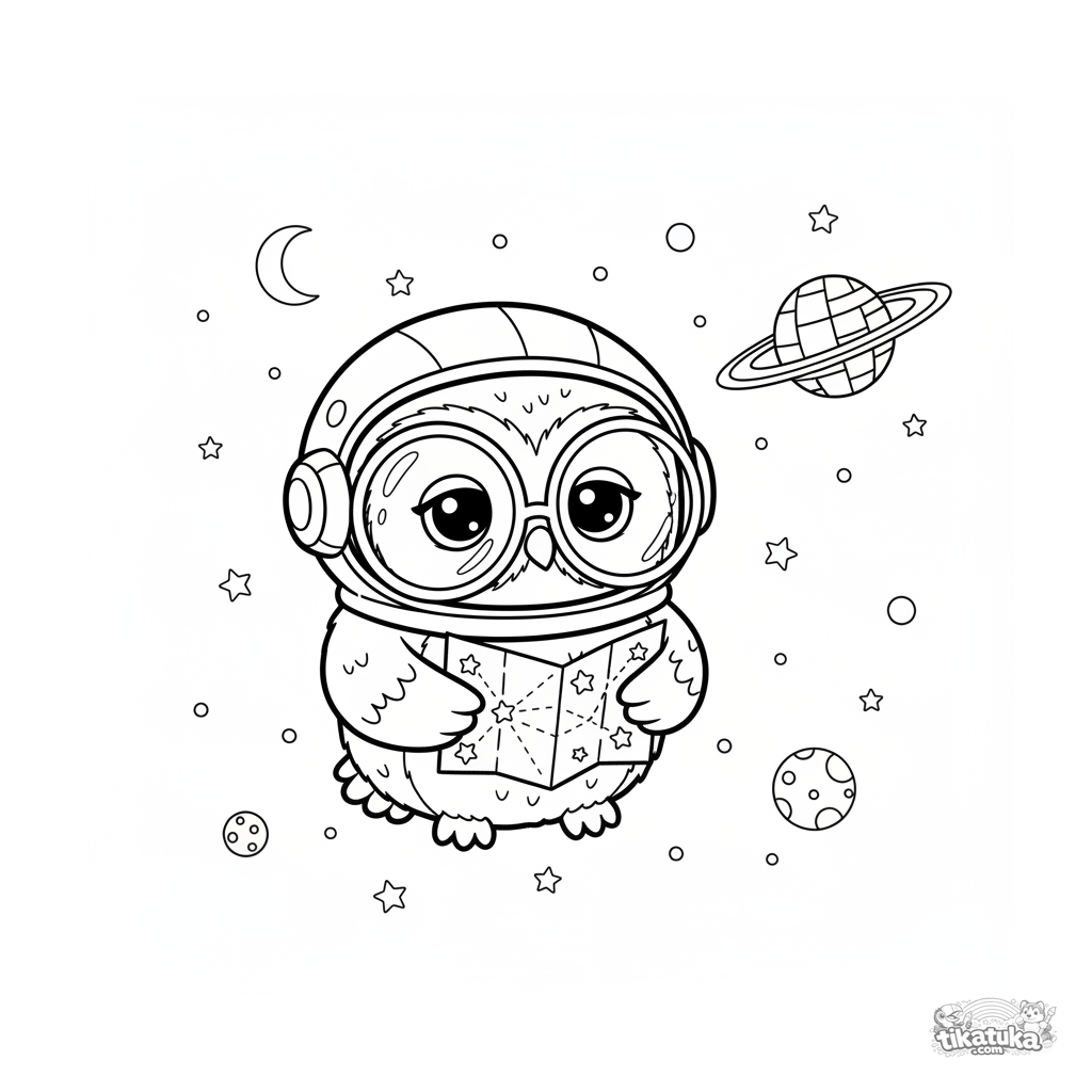 Раскраска для детей 4-6 лет: милый совёнок-библиотекарь Ух в роли астронавта летает в открытом космосе с картой звёзд. Простые линии, скандинавский стиль плюшевой игрушки.