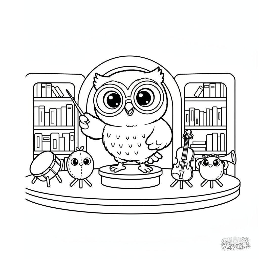 Раскраска для детей 4-6 лет: сова Уф дирижирует маленьким оркестром плюшевых инструментов. Мягкие кукольные формы, чистые контуры, скандинавский стиль, веселая музыкальная тема.