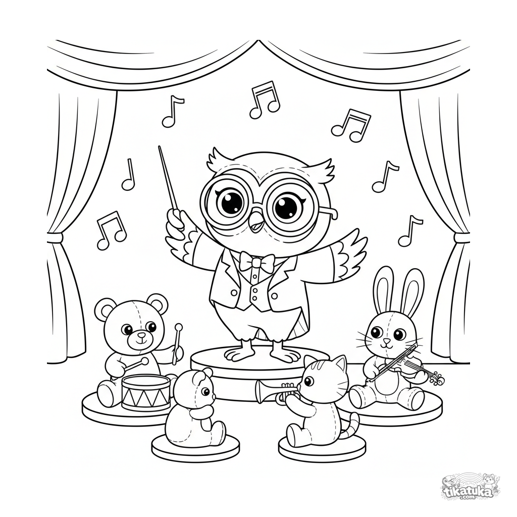 Раскраска для детей 4-6 лет: совёнок Уф дирижирует игрушечным оркестром из плюшевых зверей. Динамичная, весёлая сцена с нотами.
