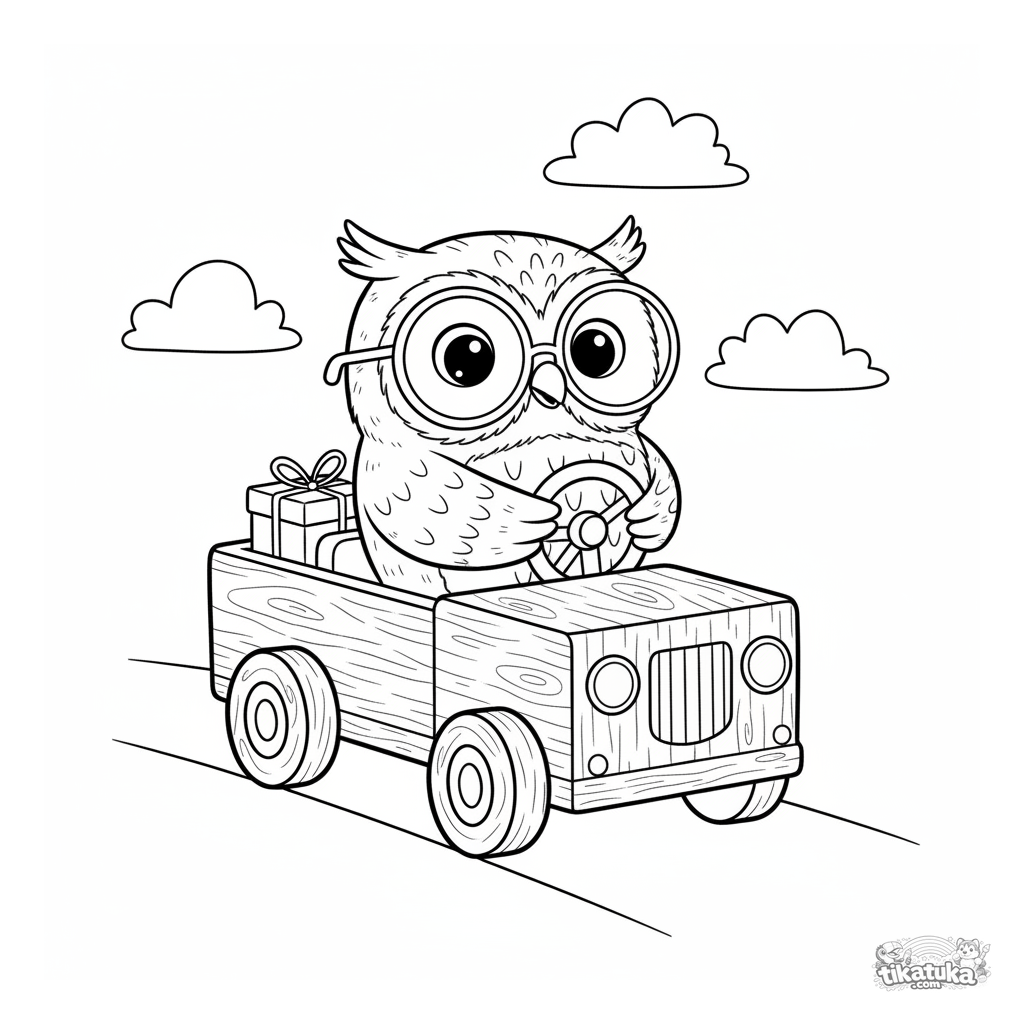 Раскраска для мальчиков 4-6 лет: совёнок Уф ведёт игрушечный деревянный грузовик. Чёткие контуры, скандинавский стиль игрушки.