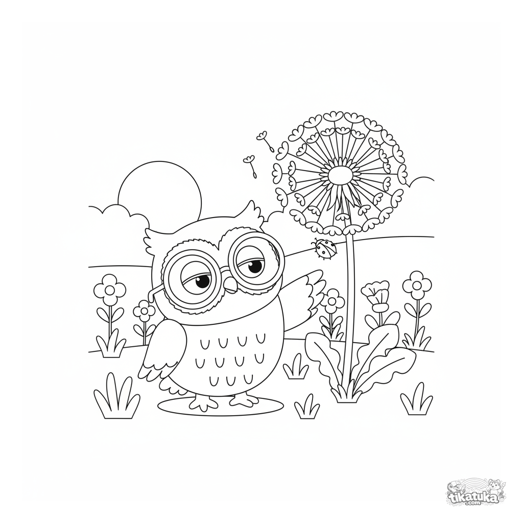 Раскраска для детей: совёнок Ух-Ух с большими очками с удивлением исследует огромный одуванчик на лугу. Милая сцена на природе, подходит для детей 4-6 лет.