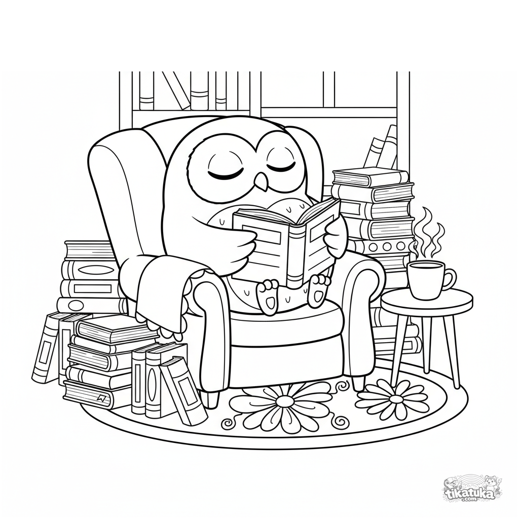 Раскраска для детей 4-6 лет: совёнок Уф читает книгу в уютном библиотечном уголке с креслом и стопками книг. Спокойная, детализированная сцена.