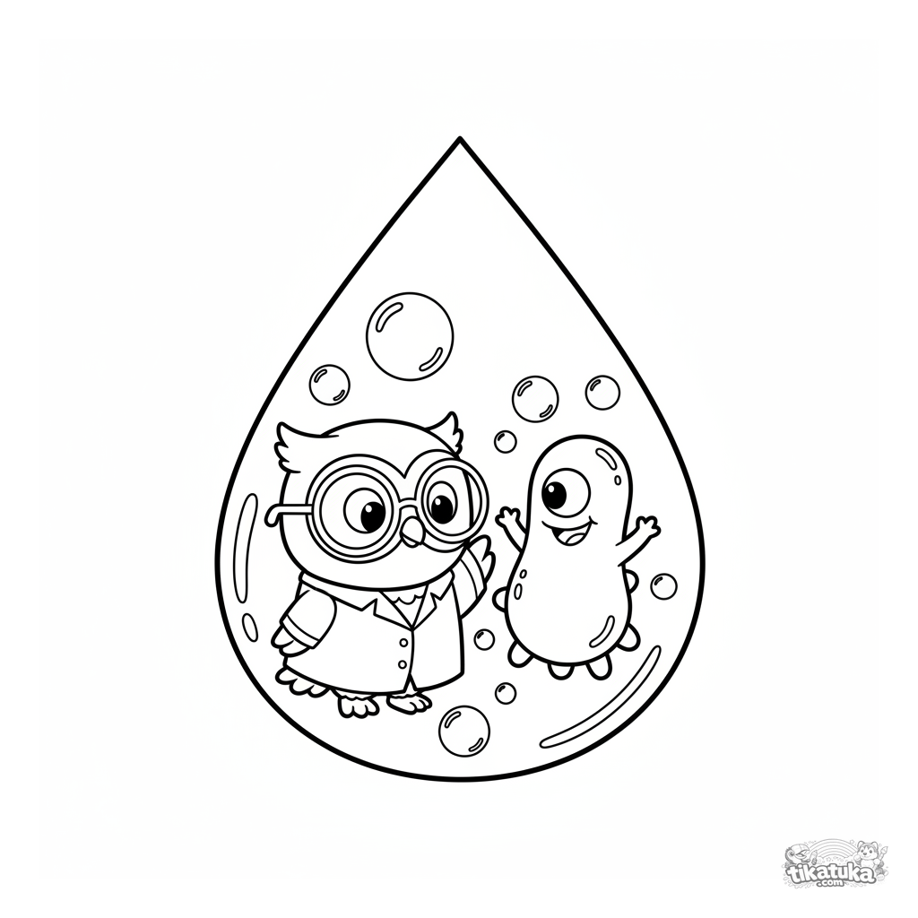 Раскраска с совёнком Уф в лабораторном халате, изучающим дружелюбного микроба внутри капли воды. Для детей 4-6 лет. Изображены пузырьки и лупа.