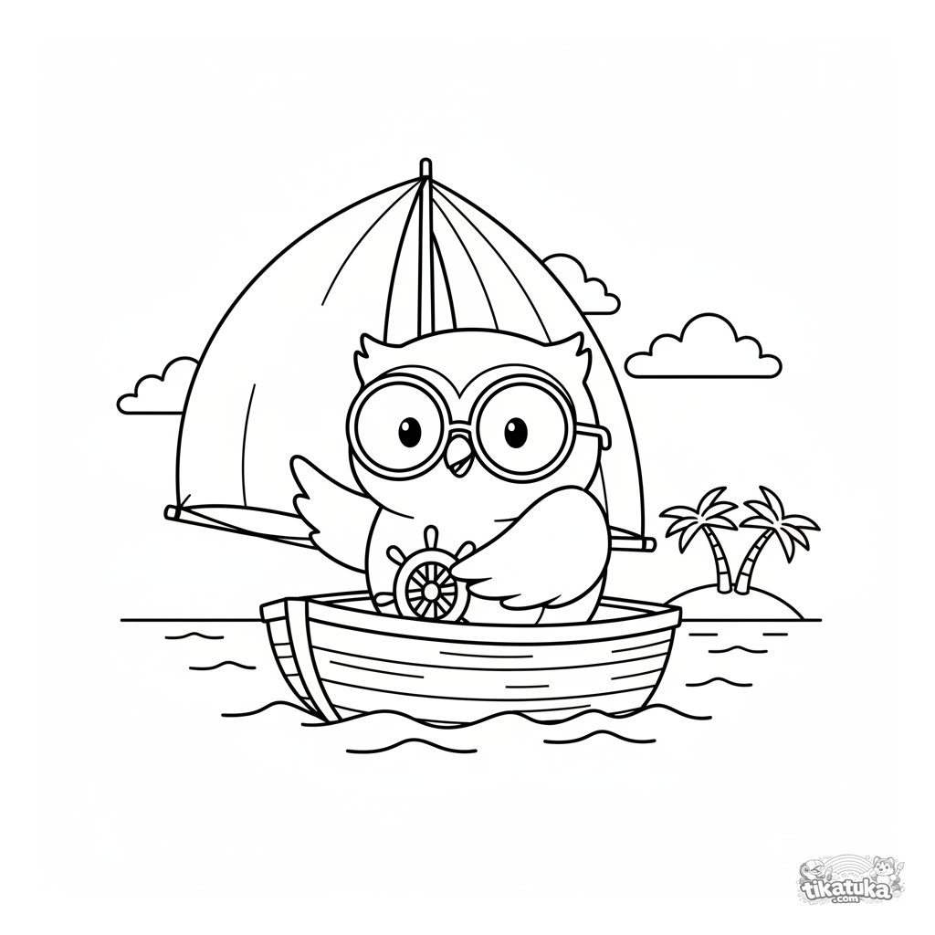 Раскраска для детей 4-6 лет: сова Уф плывет на деревянной парусной лодке по спокойной воде. Мягкие кукольные формы, чистые контуры, скандинавский стиль, морская приключенческая тема.