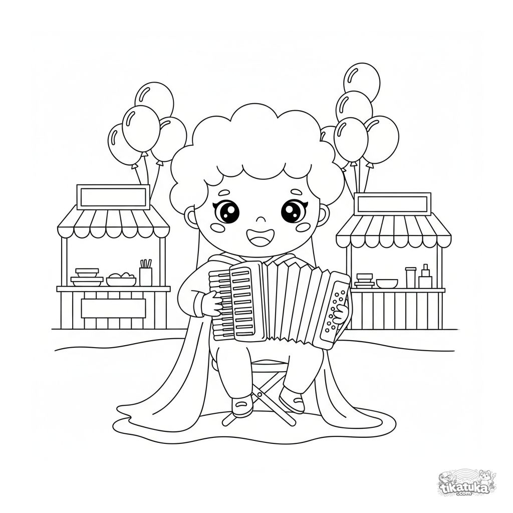 Раскраска для детей 5-8 лет: музыкант играет на аккордеоне на фестивальной поляне в стиле бумажной аппликации. Яркий, праздничный сюжет.