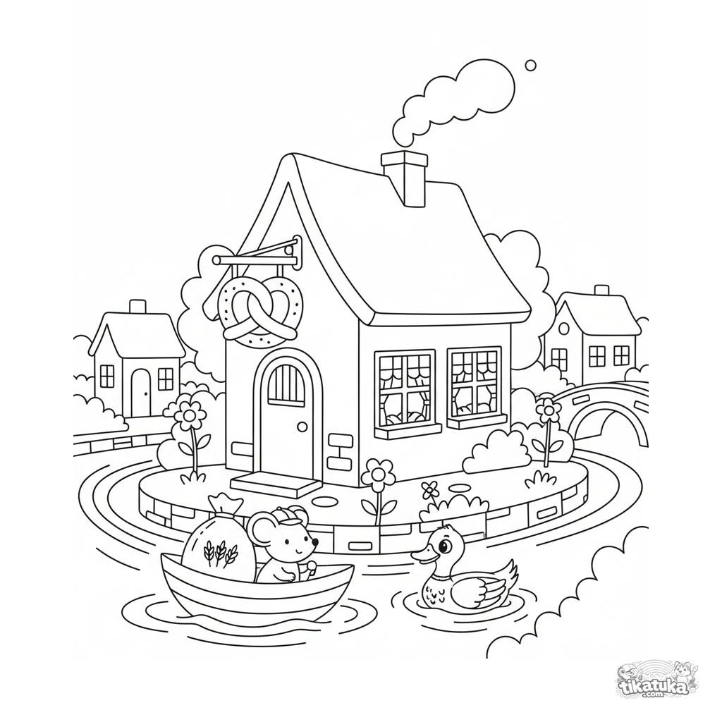 Раскраска для детей: уютная пекарня у канала и мышка-доставщик на листе-лодочке. Четкие контуры в стиле бумажной вырезки, много милых деталей.