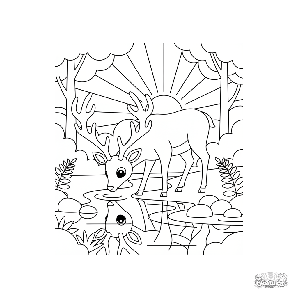 Раскраска для детей 4-6 лет в стиле бумажной вырезки: олень с ветвистыми рогами пьёт из ручья. Графичные силуэты, отражение в воде и стилизованные лучи солнца.