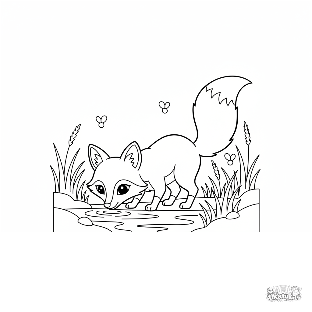 Раскраска для детей 7-9 лет в стиле бумажной аппликации: лиса с пушистым хвостом пьёт из ручья в сумерках, вокруг светлячки.