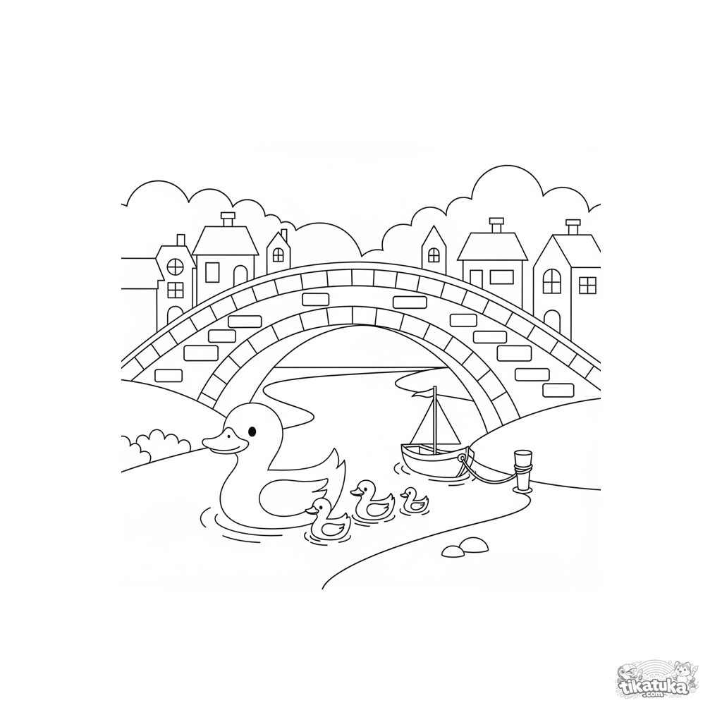 Раскраска со старым каменным арочным мостом для детей 5-9 лет. Изображен мост через реку с утками, лодкой и домиками на берегу.