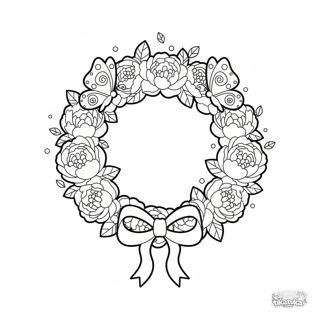 Раскраска для детей 7-9 лет: декоративный венок из пионов и листьев в стиле бумажной вырезки с симметричными бабочками и лентой.