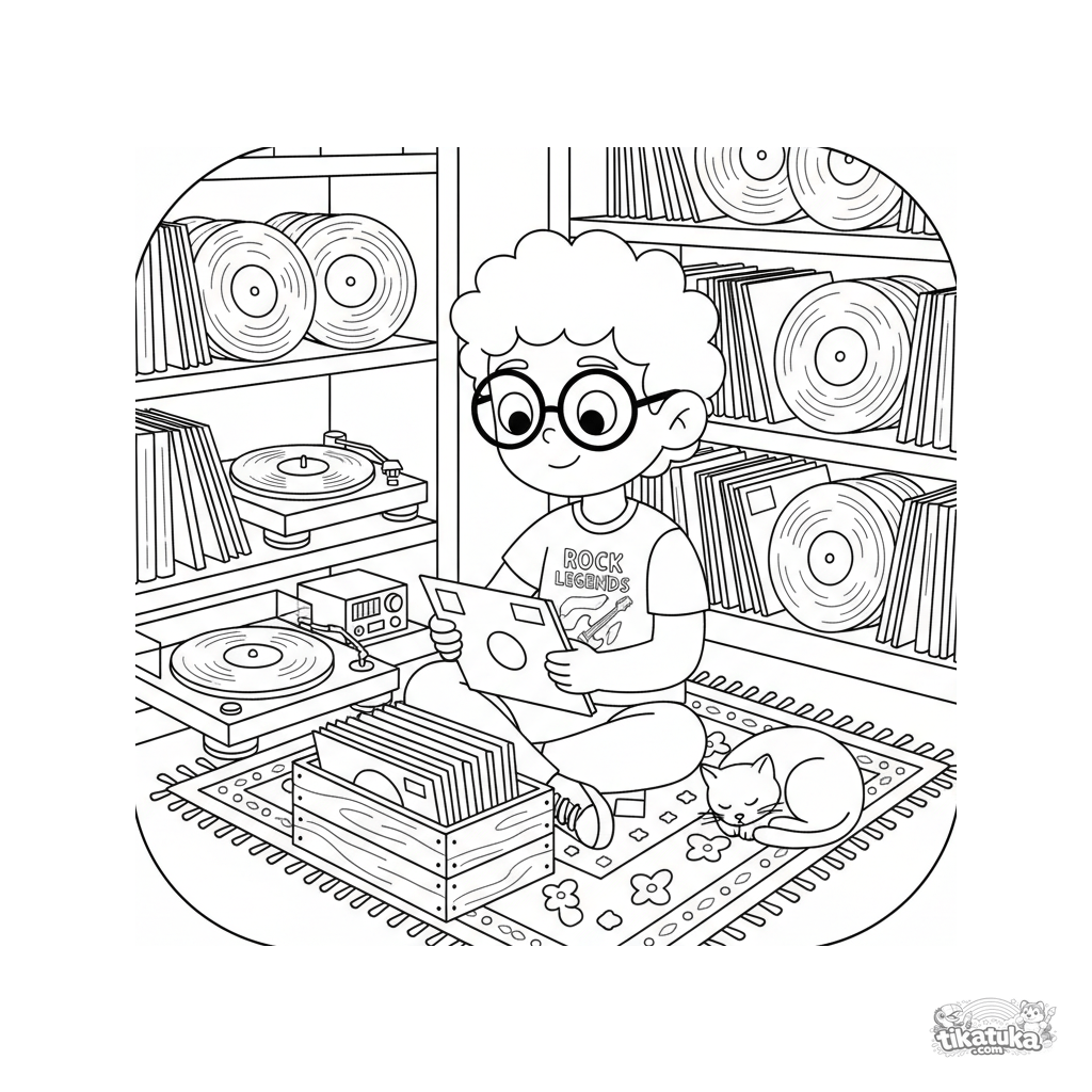 Раскраска в стиле бумажной вырезки для детей 7-12 лет: коллекционер виниловых пластинок изучает обложку в уютном уголке музыкального клуба. Теплая, детализированная сцена с котом.